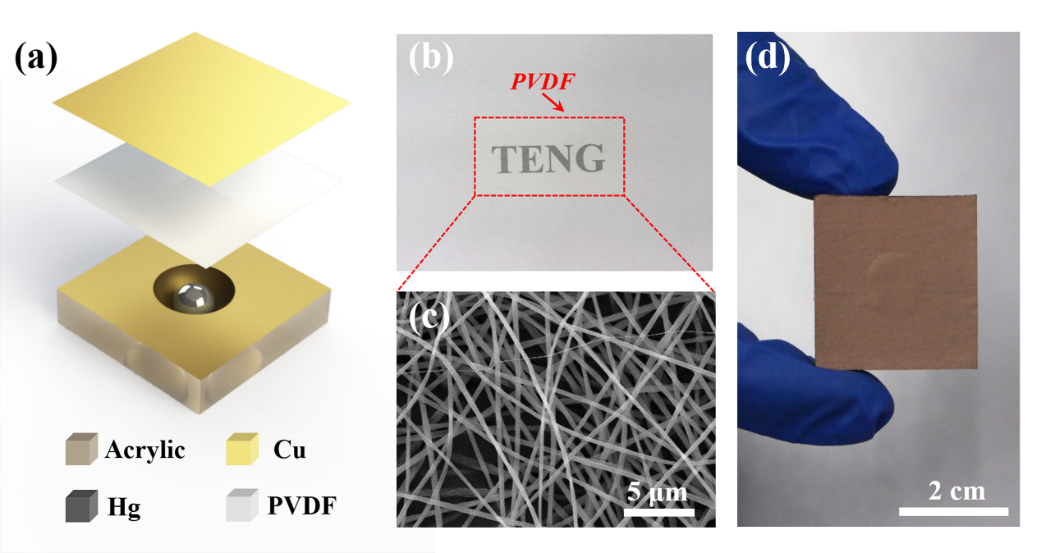 杨维清教授和美国佐治亚理工学院著名科学家王中林院士共同指导下,西南交大16级博士生张彬彬和15级博士张磊,发明了一种基于液态金属摩擦纳米发电机的自驱动加速度传感器。如图1所示,该传感器主要由液态金属以及纳米纤维薄膜组成。应用聚合物纳米纤维结构可以显著提高加速度传感器的输出性能,该加速度传感器的量程达到0-60 m/s2,其灵敏度高达0.26 V•s/m2,当加速度为60 m/s2时,该加速度传感器可以产生15.5 V的电压以及300 nA的电流。使用液态金属则赋予了该加速度传感器优异的耐久性能,在连续测试200 000周期后,传感器的输出电压基本没有变化。该加速度传感器可以实时监测车辆以及一些机械装置的微弱振动,并且可以作为可穿戴设备,实现人体运动的步态分析。该加速度传感器在振动监测、分析以及可穿戴设备中具有极高的应用潜质。