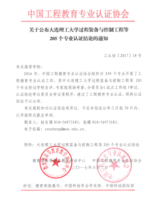 2017年6月2日,教育部高等教育教学评估中心、中国工程教育专业认证协会正式发布《关于公布大连理工大学过程装备与控制工程等205个专业认证结论的通知》(工认协[2017]18号),公布了2016年参加全国工程教育专业认证的部分专业认证结论。 2016年,中国工程教育专业认证协会组织对249个专业开展了工程教育专业认证工作,其中大连理工大学过程装备与控制工程等205个专业经过学校自评、专家组现场考查、认证结论审议委员会审议等程序,全国高校共有205个专业通过认证,我院材料成型及控制工程专业名列其中,有效期为3年(2017.1-2019.12)。材料成型及控制工程(焊接)专业成为大发体育