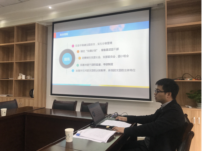 首先,黄德明老师以问题为导向做了题为“服务团改 夯实基础 突破创新”的工作汇报,从活动缺乏统筹,形式单一、基层团支部建设薄弱、团员青年权益维护不畅通、党团对接不畅通,活动满意度低及未来展望等六个方面向何诣寒副书记进行了简要汇报。