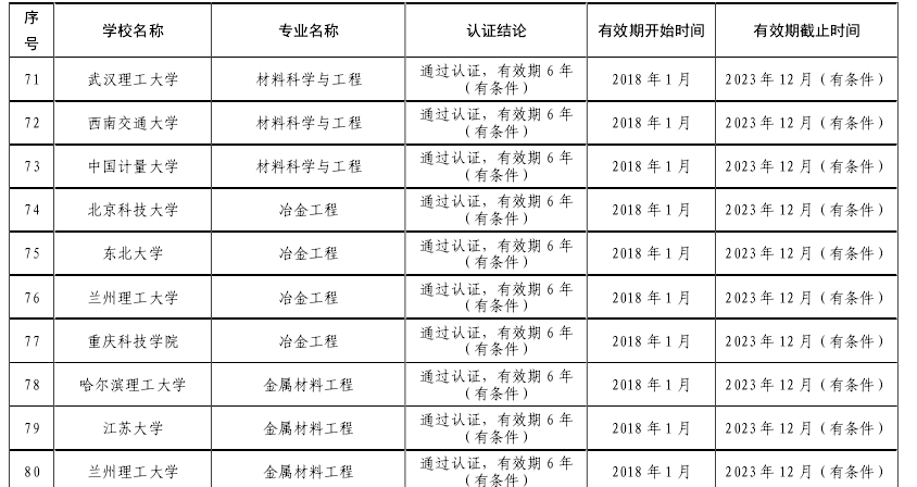 材料科学与工程专业(金属与无机非金属方向)等293个专业经过学校自评、专家组现场考查、分委员会(试点工作组)审议、认证结论审议委员会审议等程序,通过了工程教育专业认证,有效期为6年(2018.1-2023.12)。通过专业认证,标志着我们专业的质量实现了国际实质等效,进入全球工程教育的“第一方阵”。