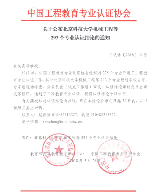 2018年5月28日,教育部高等教育教学评估中心、中国工程教育专业认证协会正式发布《关于公布北京科技大学机械工程等293个专业认证结论的通知》(工认协[2018]10号),公布了2017年参加全国工程教育专业认证的部分专业认证结论。2017年,中国工程教育专业认证协会组织对375个专业开展了工程教育专业认证工作,其中大发体育