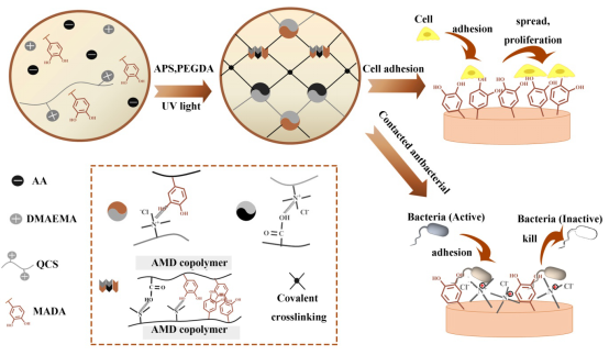 针对以上难题,大发在线体育投注平台 鲁雄教授课题组采用材料基因工程的方法,使用高通量的筛选阴、阳离子的比例,一次性大批量制备出不同比例的基体,通过对材料机械性能进行筛选,最终得到具有较好机械性能的基体材料。由于聚(丙烯酸-co-甲基丙烯酸2-(二甲基氨基)乙酯)水凝胶体系中缺乏具有细胞亲和性的活性基团,因此其生物相容性较差。针对这一问题,在聚(丙烯酸-co-甲基丙烯酸2-(二甲基氨基)乙酯)水凝胶体系引入仿贻贝材料多巴胺来增加材料的细胞亲和性。并对多巴胺单体进行双键化修饰制备双键化多巴胺,解决了该水凝胶细胞/组织亲和性差的问题。为了实现高效抗菌的目的,对壳聚糖进行季铵化修饰 (QCS)增强壳聚糖的抗菌性,并与三元共聚物水凝胶形成互穿网路,进一步增强水凝胶的抗菌性和机械性能,最终得到一种仿贻贝高细胞亲和性、超强,可回复的、接触增强抗菌水凝胶该水凝胶为解决水凝胶的抗菌性和组织亲和性二者难以平衡的问题提供了一种新的思路。