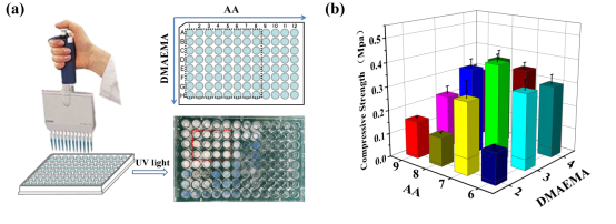 1. (a)阴阳离子比例的高通量制备以及力学性能筛选。(a)阴阳离子水凝胶阵列的高通量制备以及实物图;(b)水凝胶(红色虚线区域)的压缩强度