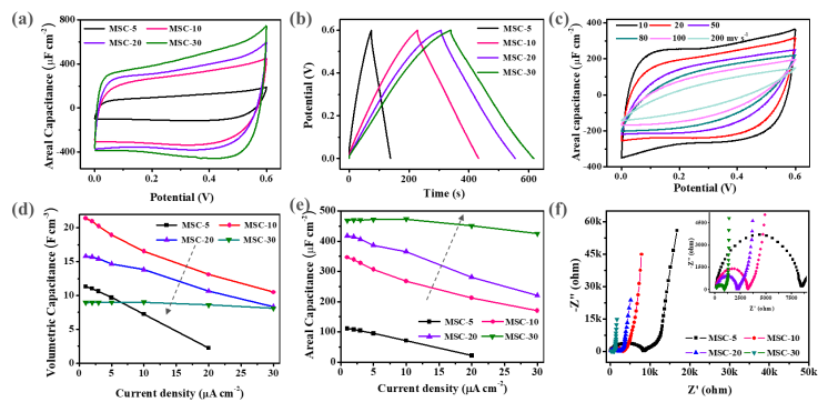 图3. 芯片式MSCs的电化学行为分析。 (a) 不同MSCs在10 mV s-1的CV曲线;(b) 不同MSCs在0.1 μA cm-2的GCD曲线;(c) MSC-30在扫描速率从5 mV s-1到200 mV s-1的CV曲线;(d) 不同MSCs在不同电流密度下的体积比电容;(e) 不同MSCs在不同电流密度下的面积比电容;(f) 4种器件的奈奎斯特图。