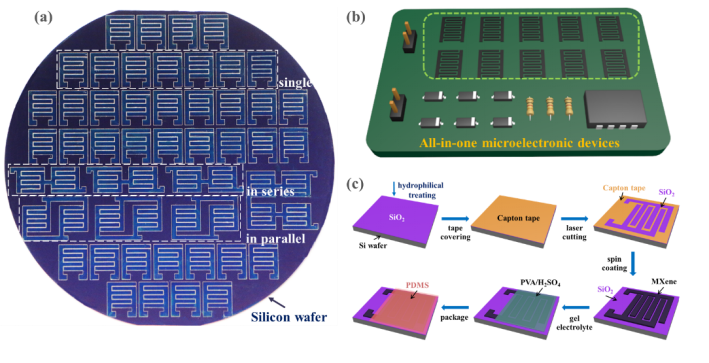 图1. (a) 规模化制造芯片式MSCs的实物图。(b) 芯片式MSCs与其他on-chip器件的集成示意图。(c) 芯片式MSCs的制造流程图。