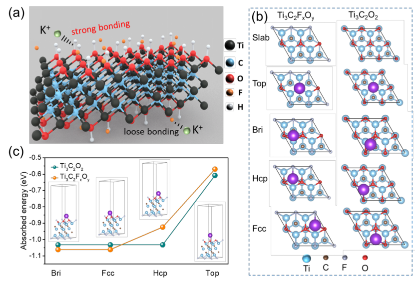 图5. MXene结构的DFT计算。(a) 通过调节MXene表面官能团从而缓解自放电的示意图。(b) 不同的功能化Ti3C2Tx吸附K原子的结构图。(c) 不同位置的吸附能。