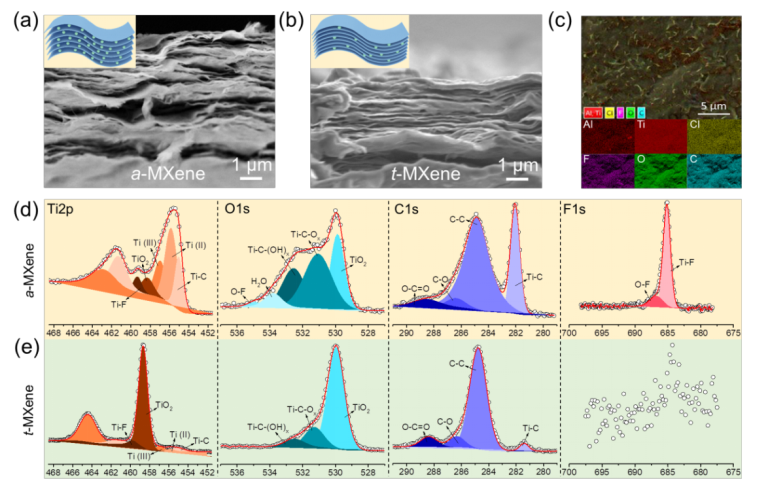 图3. a-MXene和t-MXene自支撑薄膜的形貌和成分组成。(a) a-MXene和(b) t-MXene自支撑薄膜典型的扫描电镜图。(c) t-MXene膜的能谱图。(d) a-MXene和(e) t- MXene薄膜的高分辨X射线光电子能谱。