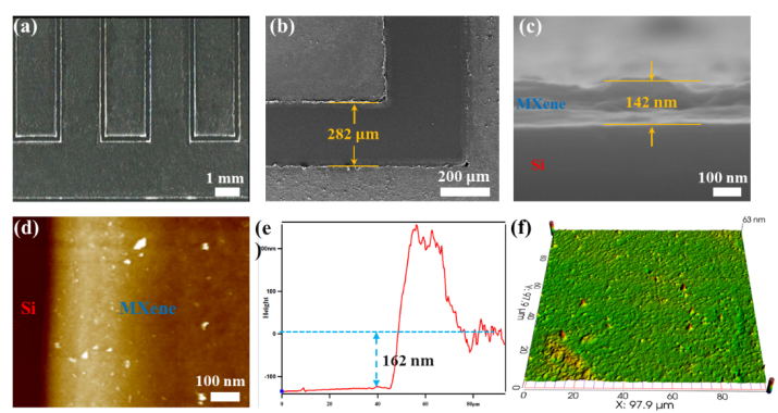 图2. 芯片式MSCs的表面形貌和结构表征。 (a) 叉指状MXene电极的光学显微镜照片;(b) 叉指状MXene电极的SEM图片;(c) 叉指状MXene电极的截面SEM图片;(d) MSC-10的AFM图片;(e) MXene薄膜的厚度约为162nm;(f) 表面轮廓显示出MSC-10表面的均匀性。