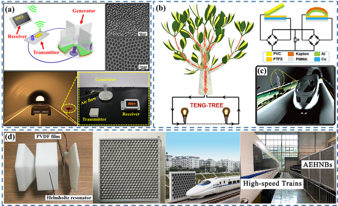 在人类历史上,交通使人类认识世界,促进文化交流,为人类文明发挥着不可或缺的作用。而得益于交通的发展,人类在实际道路与文明道路上都可以走得更远。在现代生活中,尤其是在城市交通网络,智能交通系统(ITS)的出现为了人类的安全和方便提供了更好的保障。传感器作为智能交通系统的基础,广泛用于信号采集。而在整个系统中,只有传感器工作,大数据以及后续处理才能对运输调度起作用,才可以称之为智能化。由于微电子技术的发展,小的传感器具有更低的能源消耗。但是用于传感器的电源(如电池)储存的电能仍然是有限的。并且频繁地替换或重新为电池充电对于数量巨大的分布式传感器是一个巨大的工程。与此同时,废旧电池还会给环境带来很大的影响。而另一方面,传统的电缆电源由于传感器数量的增加,出现了越来越复杂的布线问题。在这方面,自供电技术便显得尤为重要。幸运的是,纳米发电机不仅可以在交通载体运行过程中获取环境能量,为其任意分布的多个传感器供电,还可以作为主动式传感器,实现对智能交通系统的自供电无线监控。