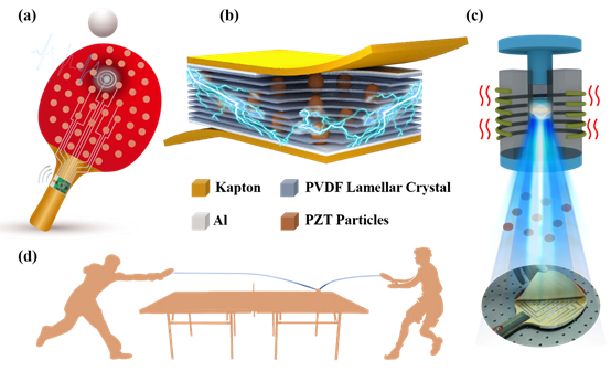 2018级硕士研究生田果通过非溶剂诱导相分离联合高压结晶的两步法研制了一种具有独特富含片晶结构的类千层饼状柔性PZT/PVDF压电复合传感器。利用该独特结构所具有的层间电势累积效应和快速的应力释放,实现了传感器优异的灵敏度 (6.38 mV/N),超快的响应时间 (21 ms),和良好的机械稳定性。并将其集成在乒乓球拍上用于准确检测击球的位点和作用力,进而反馈运动员的状态并为其提供个性化训练指导,展示了巨大的应用前景。同时该成果也在传统视觉监测系统之外为智能体育运动提供了一种全新的监测方式,为智能电子设备开拓了一个新的应用视角。该研究成果以 “Rich Lamellar Crystal Baklava-structured PZT/PVDF Piezoelectric Sensor Toward Individual Table Tennis Training” 为题在线发表在Nano Energy上。(论文链接://doi.org/10.1016/j.nanoen.2019.03.013)