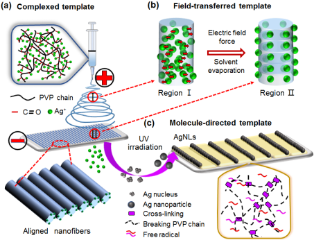 近日,西南交通大学郑晓彤课题组开发了一种新的合成方法,结合静电纺丝技术和原位UV辐照在室温下得到一维成对定向排列的银纳米链(AgNLs)。这种AgNLs不同于传统的银纳米线(AgNWs),它是依靠银纳米晶体沿着纤维模板的平行界面,实现更小定向尺度的单颗粒自组装。在整个过程中,从银离子到银单质的定向合成,PVP聚合物分子链发挥了重要的模板效应,比如:在溶液混合过程起到络合模板作用、在静电纺丝过程起到电场迁移作用、以及在原位UV辐照过程起到分子定向拉伸作用(图一)。