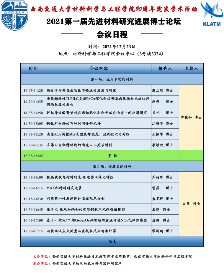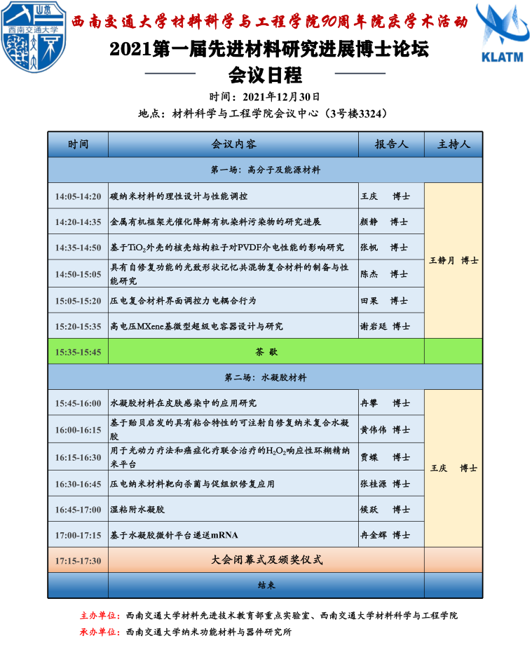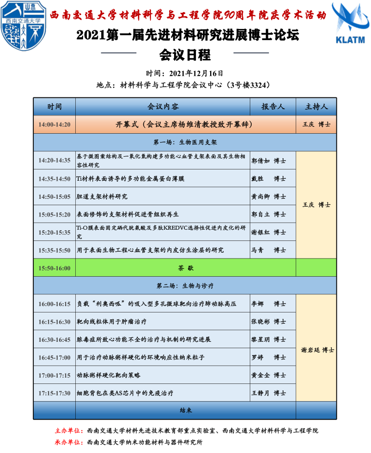 90年院庆学术活动——2021第一届先进材料研究进展博士论坛。本次论坛分为生物医用支架,生物与诊疗,医用多功能材料,金属功能材料,高分子及能源材料,水凝胶材料六个分会场,涵盖了先进材料研究前沿的36个方向,并由2021级博士进行主题报告。希望借举行此次博士论坛的契机,为大发在线体育投注平台