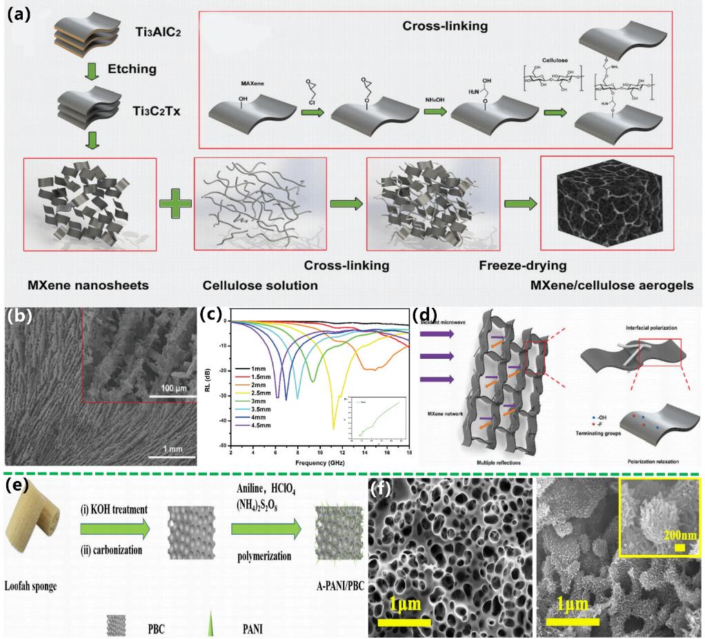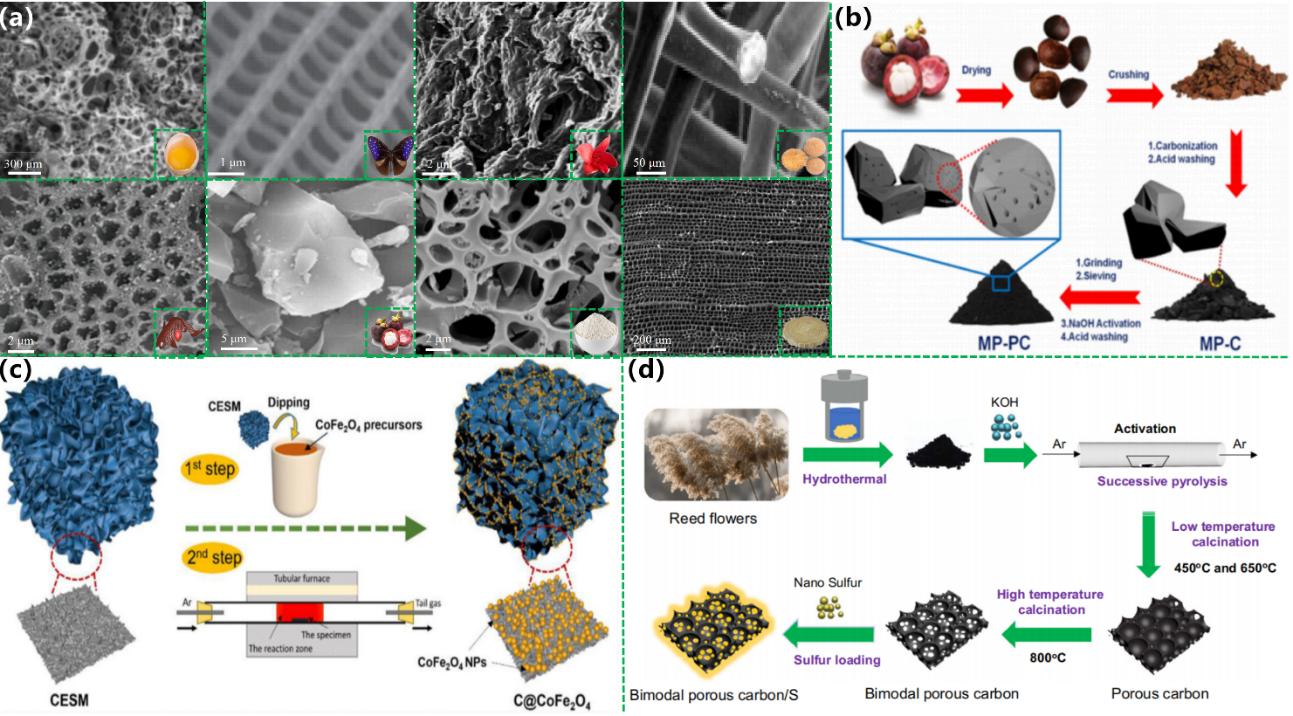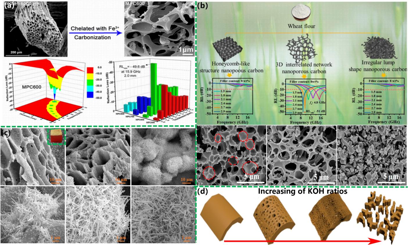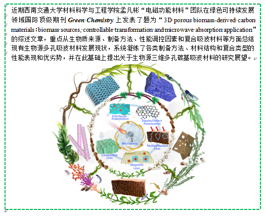 基于前期研究成果,团队受邀撰写并发表系列高水平论文(Green Chemistry, 2022;Carbon, 2021, 180, 163-184;Composites Part B: Engineering, 2021, 211, 108642;Composites Part B: Engineering , 2018, 137, 260)总结了吸波材料发展现状。近期因在生物质基吸波材料方面的工作进展,受邀在Green Chemistry期刊上撰写题为“3D porous biomass-derived carbon materials:biomass sources, controllable transformation and microwave absorption application”的综述,具体内容如下: