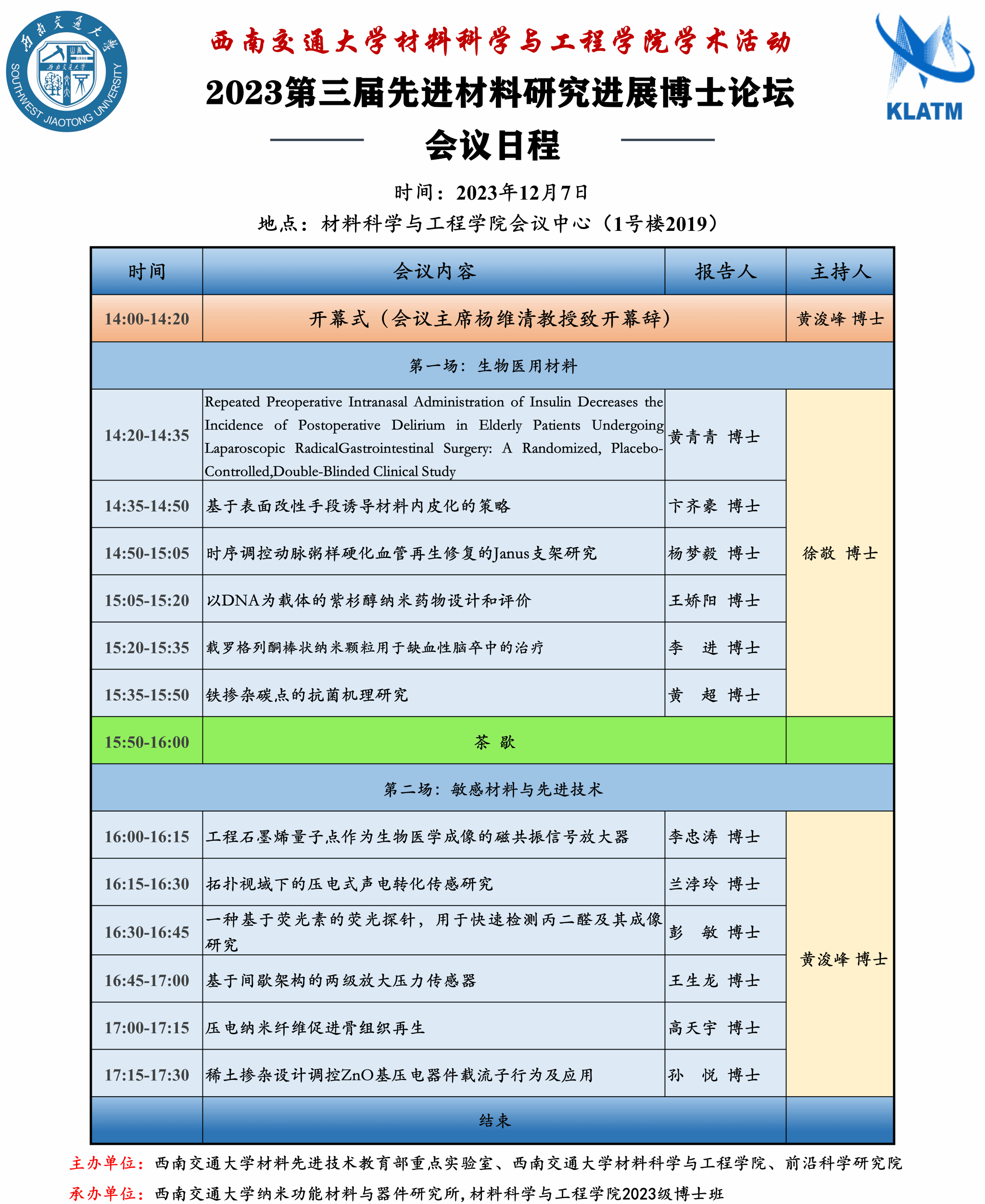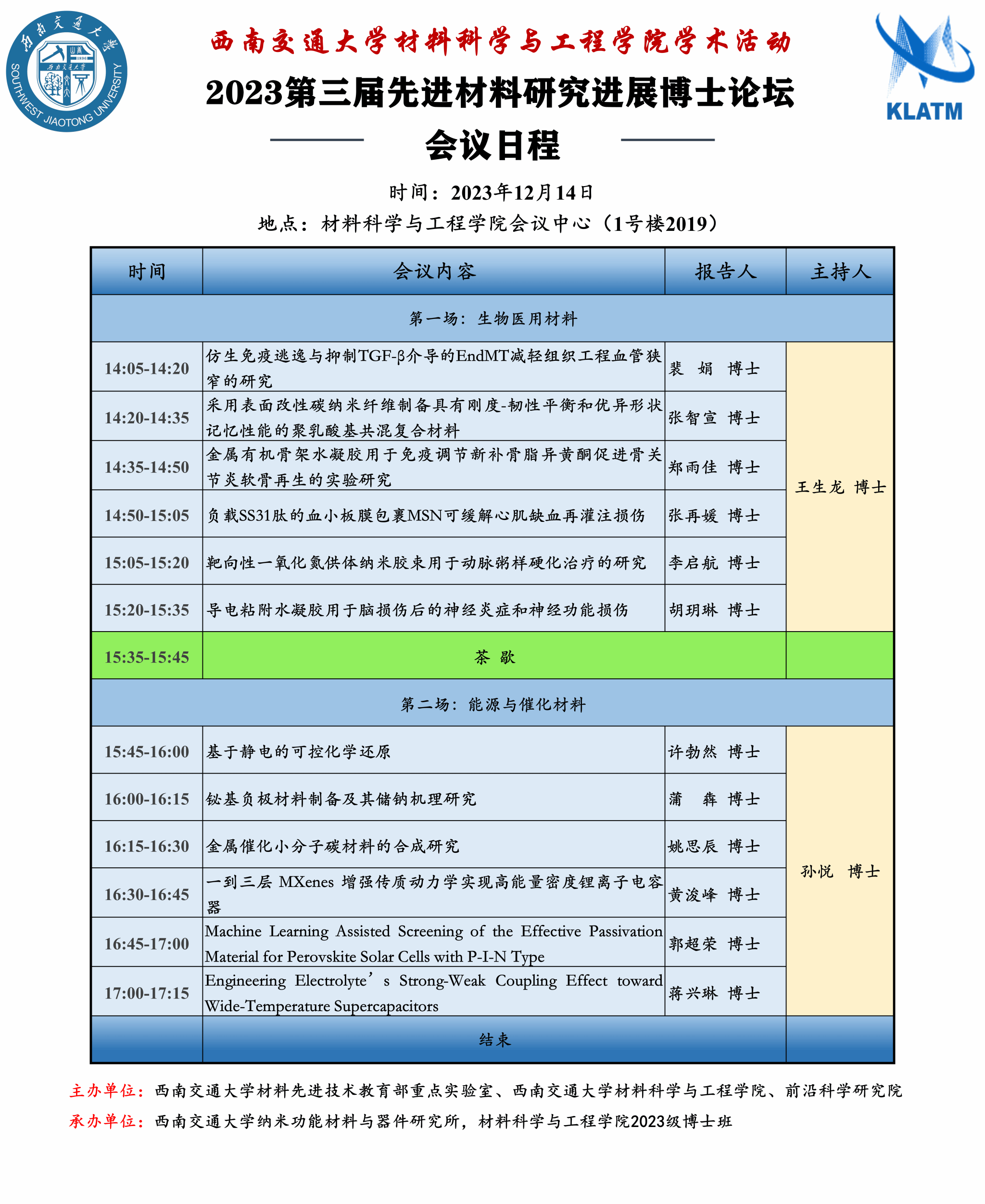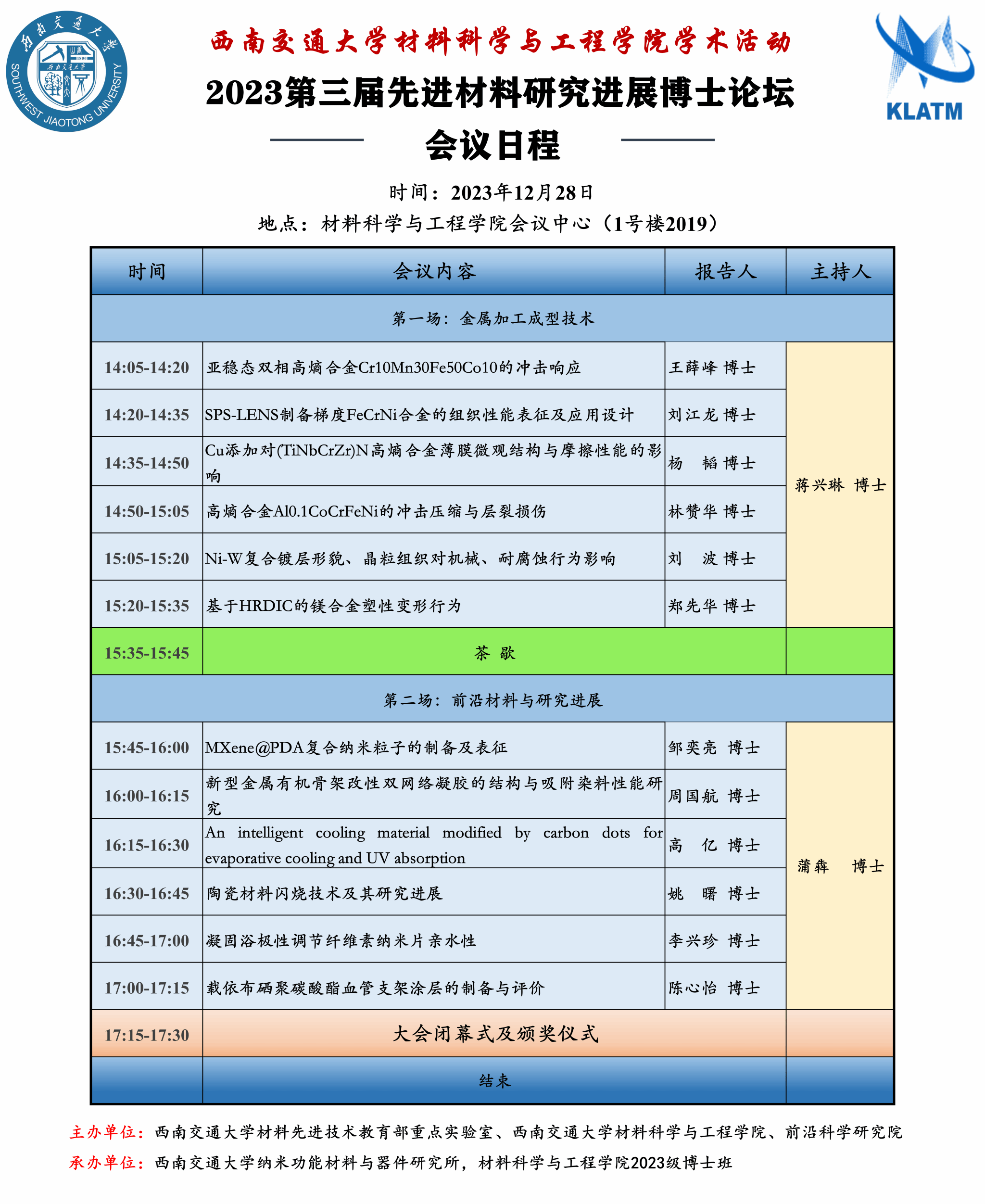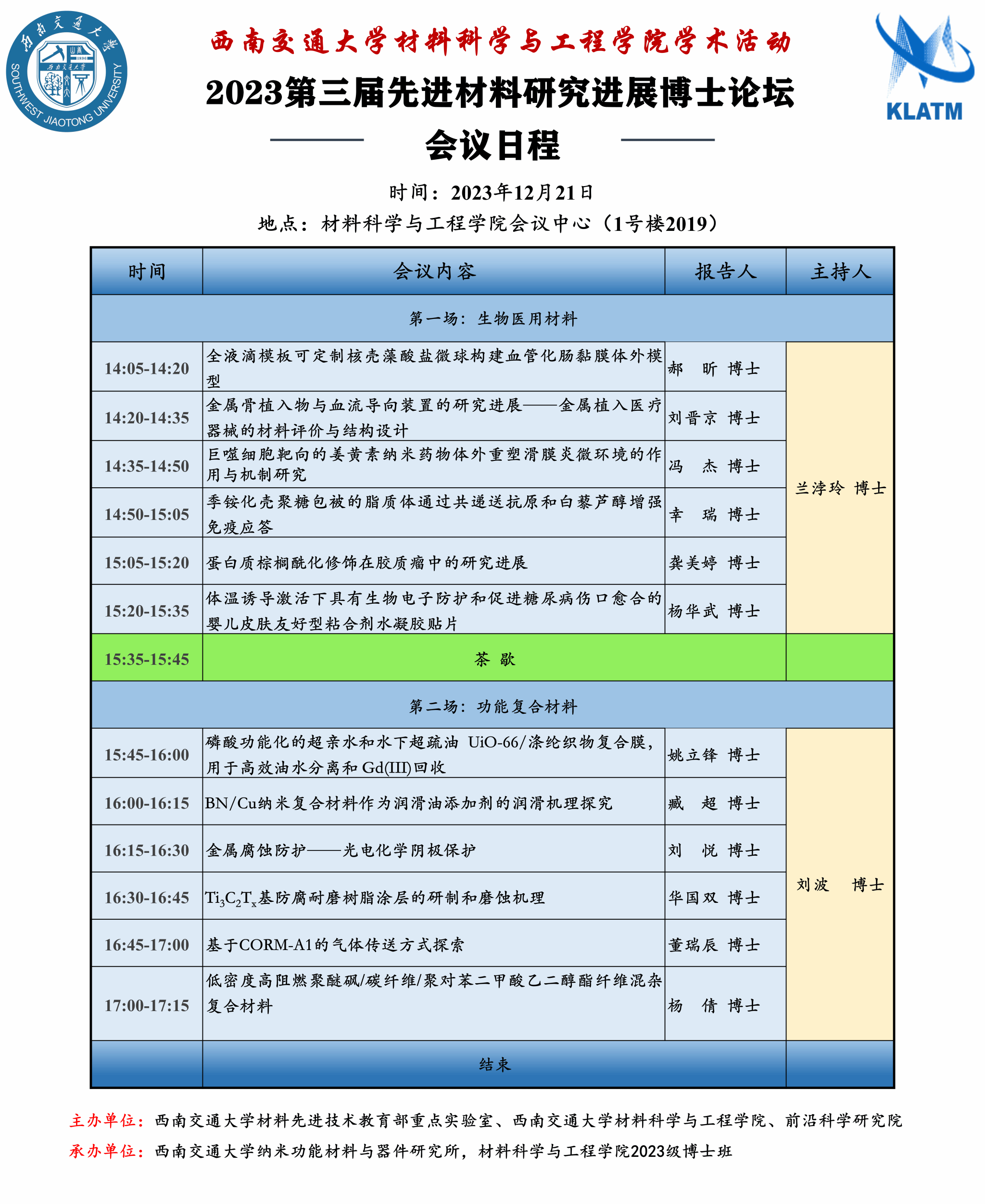 学术活动——2023第三届先进材料研究进展博士论坛。本次论坛分为生物医用材料,敏感材料与先进技术,能源与催化材料,功能复合材料,金属加工成型技术以及前沿材料及研究进展等六个分会场,涵盖了先进材料研究前沿的48个方向,并由2023级博士进行主题报告。希望借举行此次博士论坛的契机,为材料科研工作者提供研究工作交流的平台,吸引更多先进材料领域的老师进行指导,开启更深层次的创新合作。