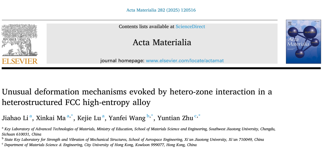 相关成果以“Unusual deformation mechanisms evoked by hetero-zone interaction in a heterostructured FCC high-entropy alloy”为题发表在工程技术-材料科学领域顶级期刊《Acta Materialia》上。论文的第一作者为大发体育