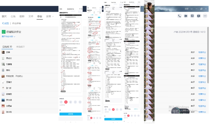 辅导员李秀娟老师以及王一涵同学的参加。会议开始由曹胜同志主持开展并说明此次云上组织生活的具体事宜。首先,组织全体参会成员切出屏幕同时在线打卡青年大学习第二期——“疫情防控的人民战争”,学习完成以后要求每位成员截屏打卡。接着,为了了解支部同志及班级成员对防疫知识的掌握情况以及疫情期间的自我防护意识,由支部书记卢敏同志将前期准备的关于防疫知识的题目以作业的形式布置在QQ群里,组织大家完成作业并提交。然后是线上分享感闻,各参会成员也纷纷发表了疫情期间的感闻,让会议气氛在轻松愉快中进行,期间各位党员同志也纷纷表达了对祖国、对武汉、对医护人员的祝福,接着由曹胜同志共享屏幕大家一起观看了关于疫情防控知识的视频。最后辅导员对此次会议进行总结,对此次云上组织生活进行了充分的肯定,并表达了对同学们的嘱托与祝福,本次云上组织生活到此结束。