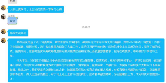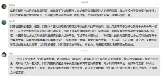 学习过后,大家陆续交流了心得体会,支部书记首先发言,对会议进行了概括性总结,并谈了自身的有关认识,在疫情期间,积极配合党中央以及四川省的决策部署,做到听课不停学,并希望支部广大党员在走上工作岗位后,应本着奉献的精神,为祖国建设出力,成为时代所需要的人才!陈志元同学认为,通过实践可以证明,党的坚强领导是战胜疫情最根本的保证,中国特色社会主义制度是战胜疫情的最大优势所在。习近平总书记说过:“我们最大的优势是我国社会主义制度能够集中力量办大事。这是我们成就事业的重要法宝”。坚持全国一盘棋、集中力量办大事、一方有难,八方支援、建立对口支援机制等等这些社会主义篇章,让我足够相信,我们国家完全有信心、有能力、有把握打赢这场疫情防控阻击战。对于处于疫情严重地区湖北的黄华贝同学,深深体会到了疫情对人们生活造成的影响,与此同时也感受到了全国各地对湖北人民的无私的关爱与帮助。当前正处在抗击新型冠状病毒肺炎的关键时期,在这样一段病毒肆虐的艰难日子里,希望我们继续带头做好自身疫情防护,保护好自己,保护好家人。遵守国家的相关规定,继续原地待命,等到抗疫战役全面胜利的那一刻!同时,希望我们可以珍惜和家人相处的宝贵时光,并加强体育锻炼,在家中继续与导师保持积极沟通。春天已经到来,疫情终将过去!
