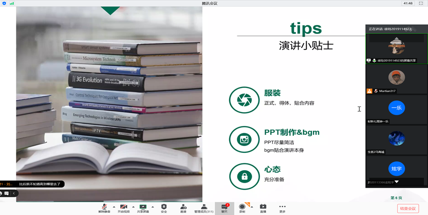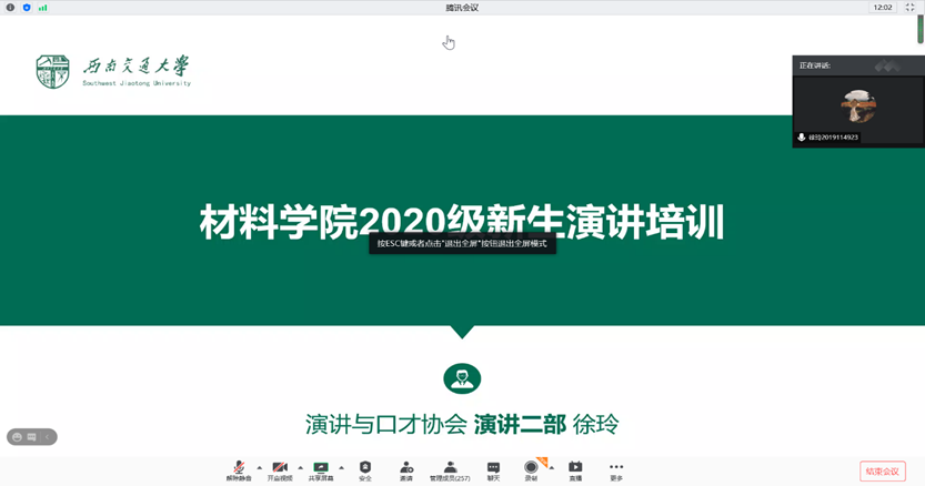本科生第二(2020级)党支部联合西南交通大学演讲与口才协会于9月20日15:00-16:00通过腾讯会议平台开展了演讲与口才基本技巧的培训活动。活动由年级助理李子浩同学主持。