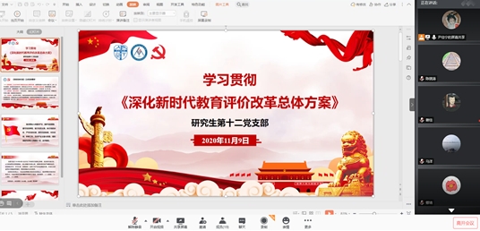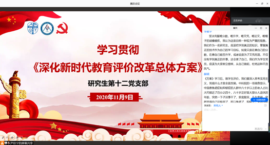研究生第十二党支部在腾讯会议组织支部党员学习讨论由中共中央、国务院印发的《深化新时代教育评价改革总体方案》(以下简称《方案》),本次学习活动由支部书记尹佳宁同志主持。