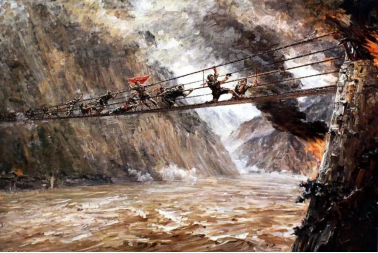 5月29日下午4时,总攻开始。吹响冲锋号吹响的刹那间,泸定河谷枪弹如疾风骤雨,喊杀声震天动地。22名红军突击队员,冲上悬空摇晃不止的铁索,向对岸爬去。紧跟在突击队后面的战士每人夹着一块木板,边铺桥边冲锋。