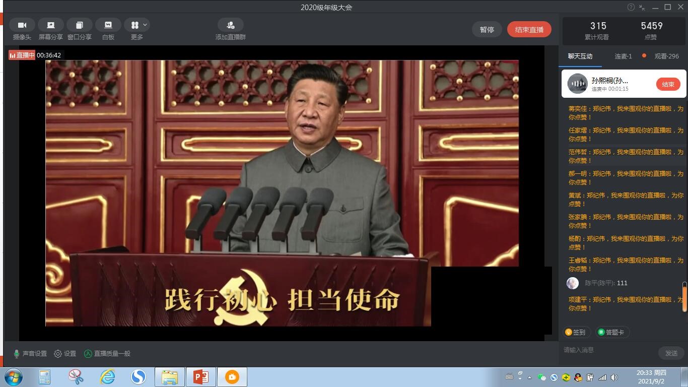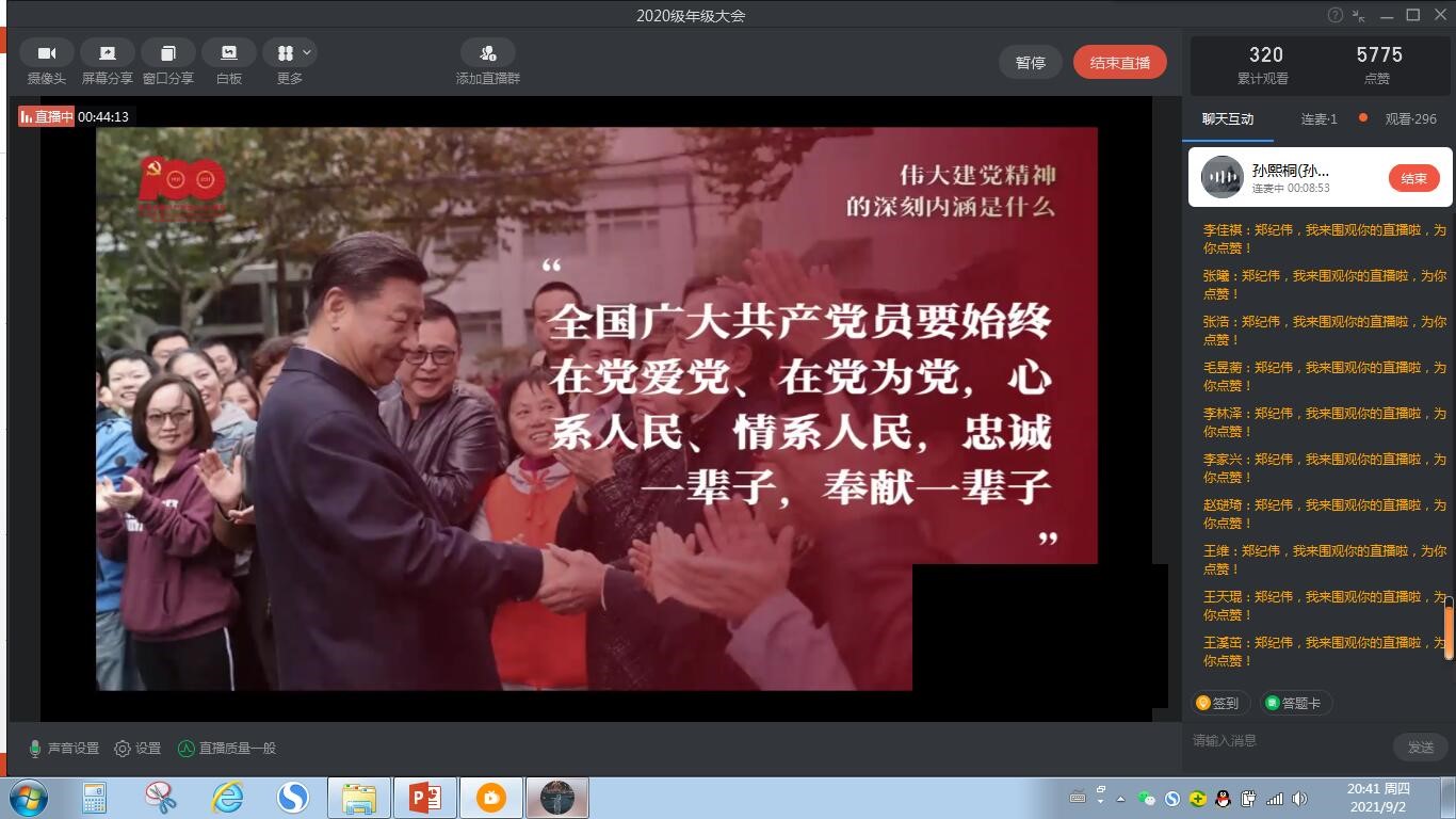 本科2020级通过钉钉平台召开伟大建党精神专题学习会。本次集体学习以“伟大建党精神的深刻内涵是什么”为主题展开。材料2020-01班临时团干部、入党积极分子孙熙桐同学领学,年级辅导员老师郑纪伟、杨婷以及全年级300余名同学参加。学习会由本科生第二党支部主办,本科2020级承办。