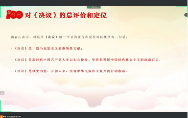 随后,张渤涛为大家介绍了《中国共产党第十九届中央委员会第六次全体会议公报》的主要内容及新闻要点,党的十九届六中全会重要的成果是审议通过了《中共中央关于党的百年奋斗重大成就和历史经验的决议》,深刻总结了党百年奋斗重大成就和历史经验,以及加强党的建设新的伟大工程,特别是党的十八大以来新形势下积累的宝贵经验。