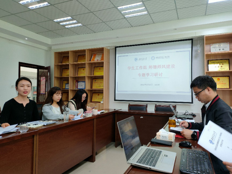 学生工作组于2022年4月22日15:00在X2128会议室组织开展《新时代高校教师职业行为十项准则》专题学习。学院党委副书记、学生工作组组长章春军为参会辅导员老师详细解读了文件出台的背景、意义及学习要点,并结合学生工作实际对辅导员日常工作中的言行举止等进行再要求再提醒。章春军强调,师德师风建设是教师队伍建设的“第一要求”,师德师风是教师评价的“第一标准”,全体辅导员老师要以习近平总书记提出的“四有好老师”为目标,做到“有理想信念、有道德情操、有扎实学识、有仁爱之心”。