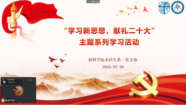 本科生第二党支部通过线上平台举行了“学习新思想,献礼二十大”主题系列学习活动第3期(第4讲,第5讲)。设计艺术学院学生工作组副组长、团委书记王雪老师,学院本科生第二党支部书记、2020级辅导员郑纪伟老师和支部新发展党员参加本次学习会。高分子2020-02班罗子萌同志主持。