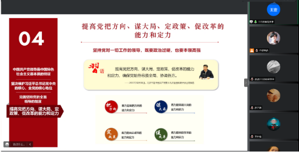 本科生第二党支部“学习新思想,献礼二十大”主题系列学习活动第4期(第7讲)在线上平台如期举行。建筑学院学生党建工作负责人、2022级本科新生辅导员袁毓璟老师,学院本科生第二党支部书记、2020级辅导员郑纪伟老师和支部新发展党员参加本次学习会。材料(金属)2020-02班冉梁雨优同志主持。