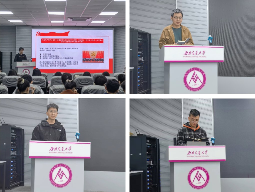 在深入学习二十大报告基础上,党支部书记带头,与会同志纷纷发言,紧密结合个人思想、学习和工作实际,谈认识、谈体会。第十四党支部书记李少智从细读大会主题关键词、行业发展角度解读党的中心任务、网络精句三个方面分享了他对党的二十大的学习感悟,强调了学习党史、新中国史、改革开放史、社会主义发展史、中华民族发展史的深刻意义;第十党支部刘云祺结合自己的研究方向“轨道交通轻量化”谈到作为一名研究生,立志以所学的科研知识,通过不断奋斗为国家轨道交通的发展贡献力量;第十三党支部申弋杰表示作为新时代青年,作为研究生,要坚定历史自信,听党话、跟党走,要脚踏实地、埋头苦干,为中国式现代化建设挥洒汗水,作出无悔的青春贡献;第三党支部胡斗结合自己家乡达州的发展,社区人民的生活现状表达了对习近平总书记提出的“增进民生福祉,提高人民生活品质”的深切感受;白朕凡表示作为一名研究生,时刻提醒自己要埋头苦学,专心科研,力争学有所成,学有所获,以实际行动切实贯彻落实党的二十大精神。