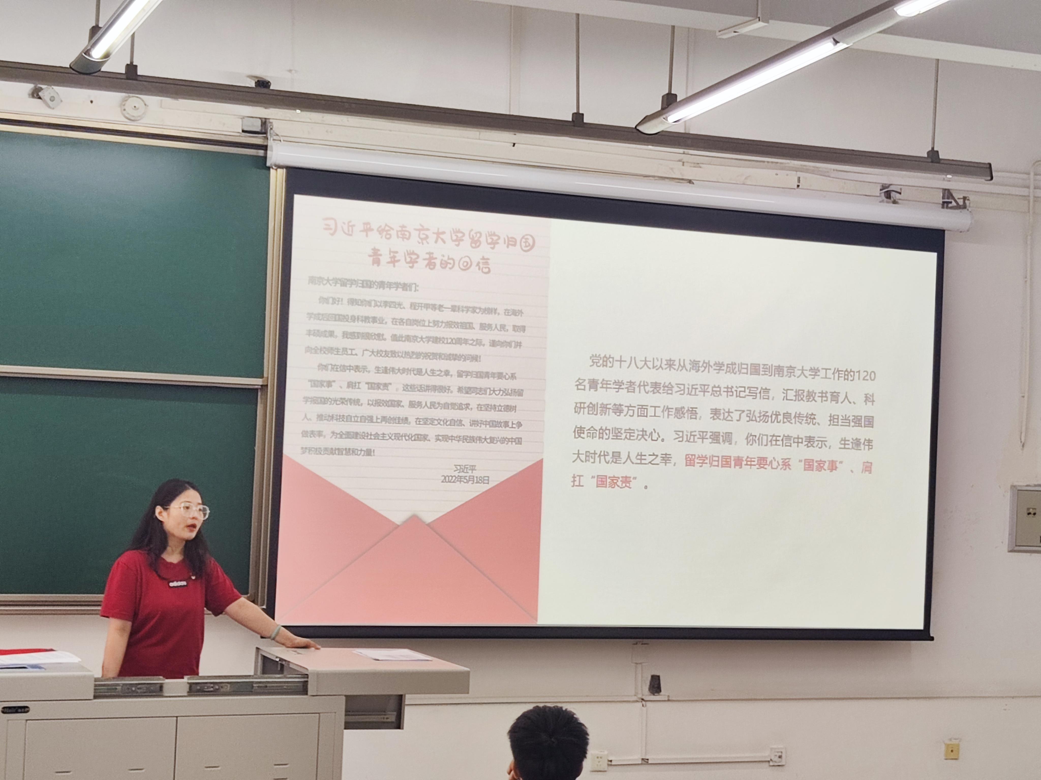 首先,王誉静同志带领大家学习了习近平总书记给南京大学留学归国青年学者以及给南开大学8名新入伍大学生的回信,勉励同志们要心系“国家事”,肩扛“国家责”,把爱国之心化为报国之行,书写绚烂、无悔的青春篇章。