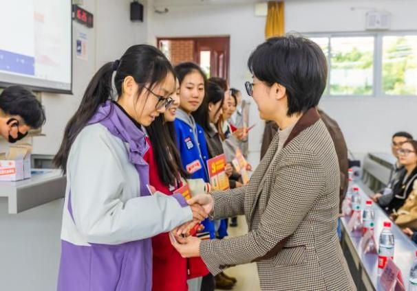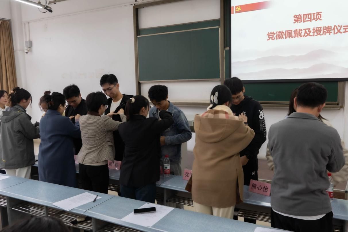 与会老师为新发展入党同志举行党徽佩戴仪式,并分组为学生党员宿舍授牌。老师们嘱托各位同志时刻牢记党员身份,做好表率,在服务师生中践行入党初心。