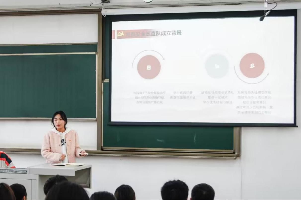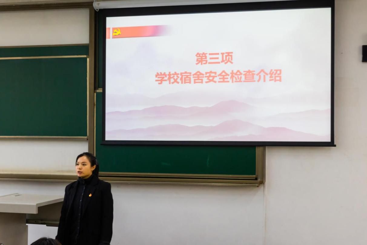 刘颖老师为大家介绍了学校宿舍安全检查工作情况。她指出,学校高度重视宿舍消防安全,不断加强检查力度,并介绍了检查中发现的突出问题。刘颖积极评价了学院在落实宿舍消防安全要求中的诸多有力举措,指出开展学生党员宿舍安全巡查和宿舍挂牌工作是发挥党建引领作用的重要实践,希望同志们认真工作,发挥实效。