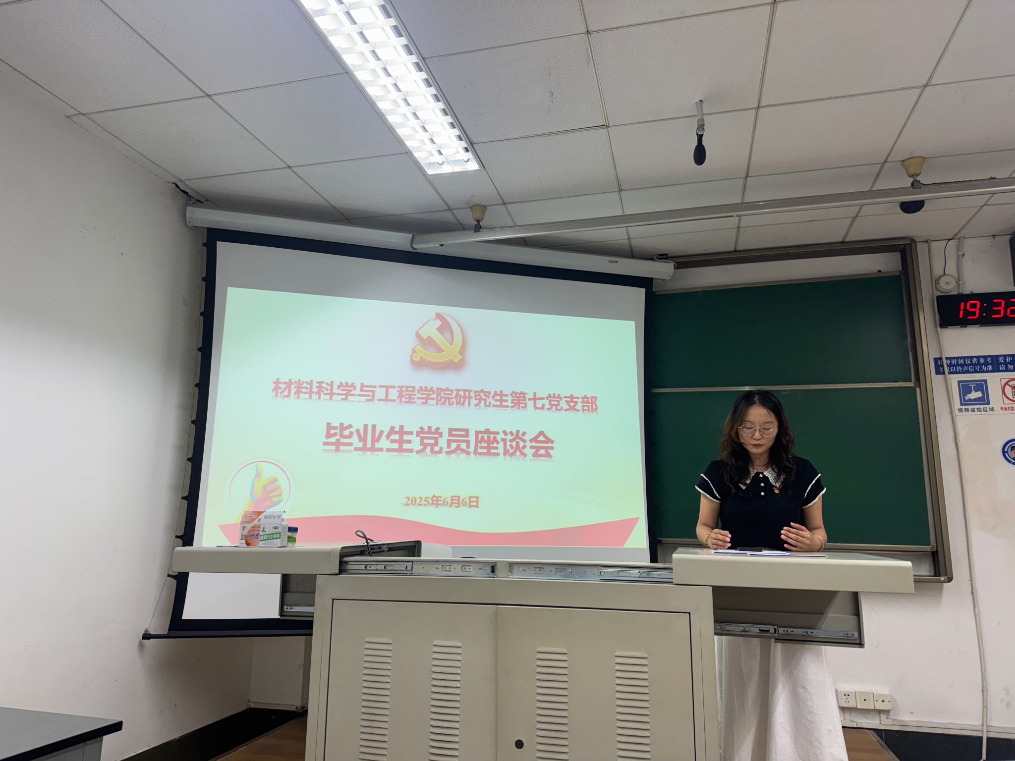 在毕业生党员座谈会上,博士研究生、国家奖学金获得者芦丽珍作为代表发言。她深情回顾了在党支部的成长历程,分享了将党性修养与科研攻关相结合的体会:"在课题组承担 ' 卡脖子 ' 技术攻关时,是党员的责任感驱使我克服困难,这让我深刻认识到,科研创新同样需要严守纪律、求真务实的作风。" 她表示,即将踏上高校科研岗位,将始终牢记党员身份,把中央八项规定精神转化为科研工作的行动准则,在新征程上践行 "材料强国" 的初心使命。