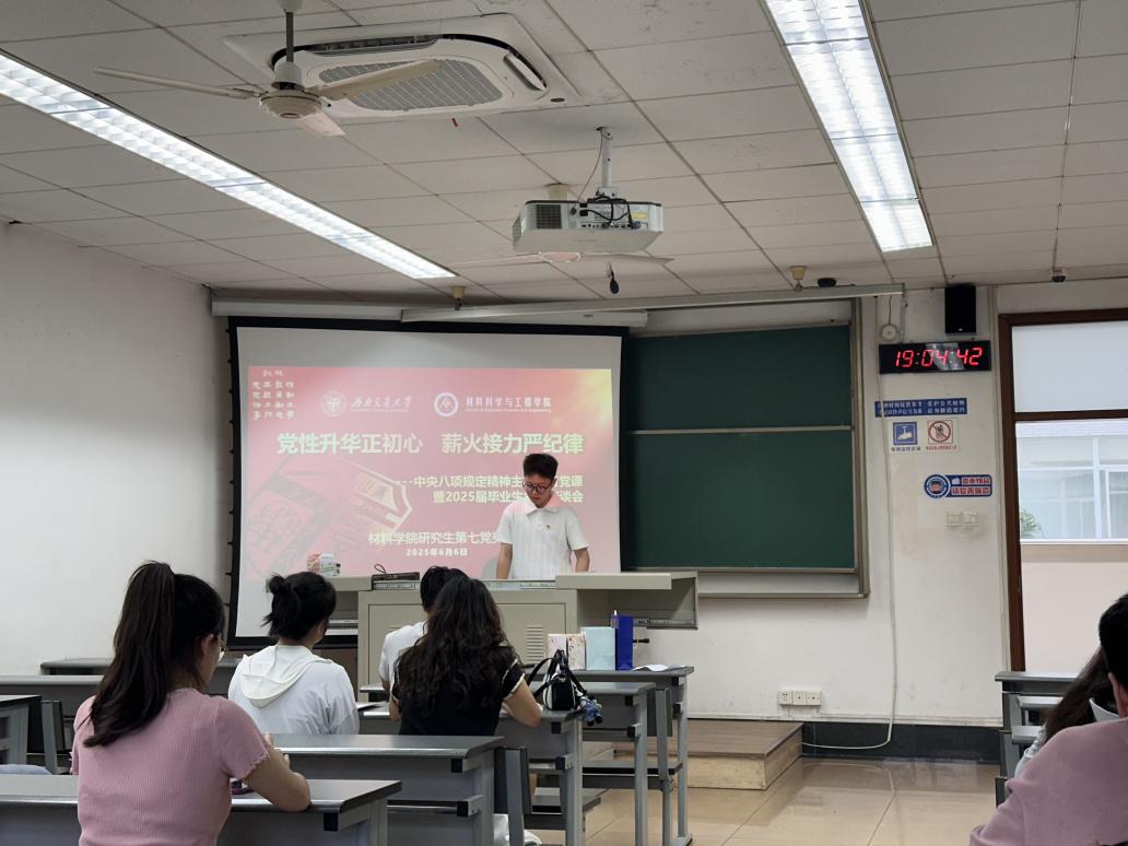 此次主题党员大会既是一次党性修养的集中淬炼,也是一次纪律规矩的再教育,更是毕业生党员的一次精神送别。研究生第七党支部将以此次会议为契机,持续深化作风建设,引导全体党员以严的基调、实的作风投身科研学习,为学校 "双一流" 建设和材料学科高质量发展贡献青春力量。